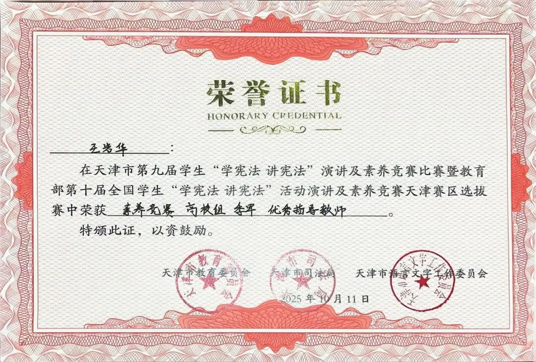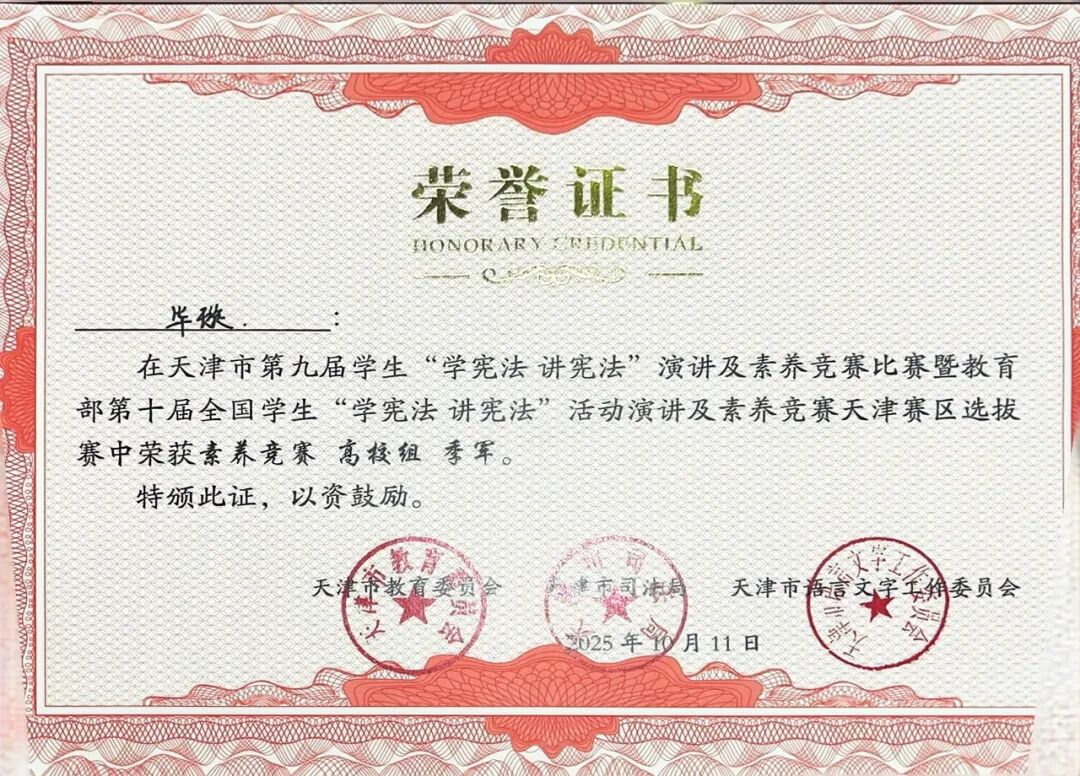 学校将以此次获奖为契机,进一步完善法治教育实践体系,依托各项社会实践项目,鼓励更多学子主动学法、自觉守法、善于用法,逐步成长为宪法的忠实崇尚者、自觉遵守者和坚定捍卫者,为推进全面依法治国、建设法治天津贡献青春力量。