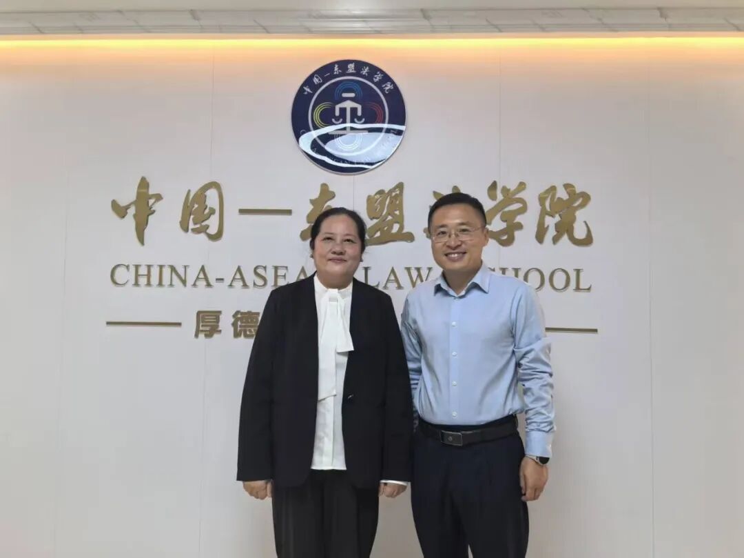 赛事期间,带队教师、学院党委书记史延鹏与广西民族大学法学院二级教授、党委书记蒋慧就涉外法治人才培养、法学专业产业学院特色学院建设、全国性专业赛事等进行交流。